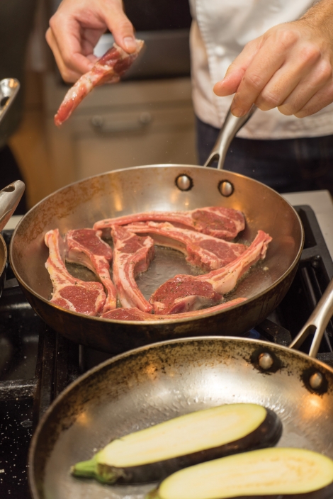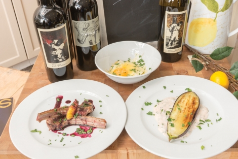 Hannah and Luke were the first team up so had the burden of breaking the ice for our challenge this year… but they did it with such enthusiasm! Choosing lamb, garlic, leeks, eggplant, lemon, and currants as their staples, they were able to create first a leek fondue with poached egg and gruyere cheese; second, a charred slice of eggplant on top of smoked paprika yogurt; and third, a dish of seared lamb chops with an orange, red wine sauce. The dishes’ presentation was immaculate, definitely professional plating. We asked Hannah, who is not a chef, where her passion for food came from, and… guess what, she got it from her momma (helped no doubt by working in several restaurants throughout college). Check out her blog at seriouseats.com and learn about cheese, restaurant etiquette, and more.